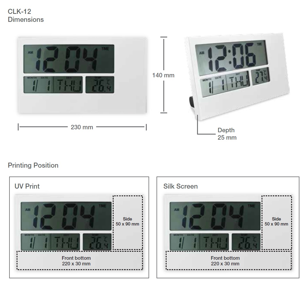 Digital clocks are small and graceful digital timepieces. These digital clocks are manufactured using PVC. As a result, they are durable and long-lasting clocks. These clocks have a digital screen. Aside from the time, it also displays the day, date, and month. As a result, it will keep you informed. Furthermore, it displays the temperature status based on your location. As a result, it is a multifunctional digital clock. This clock also has an alarm and a snooze button. As a result, you can set alarms for various occasions. This clock has a back handle. As a result, this table clock will easily stand on your table. This promotional digital clock is also a useful gift item.