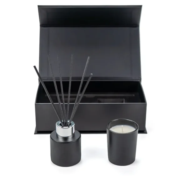 Luxury scented candle and aroma reed diffuser gift set with black matt glass, 6 diffuser sticks, and rich Citrus & Clove and Cinnamon fragrance. Premium magnetic gift box packaging is ideal for corporate gifts and promotional branding.
