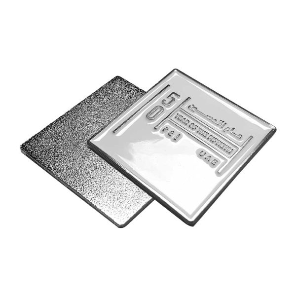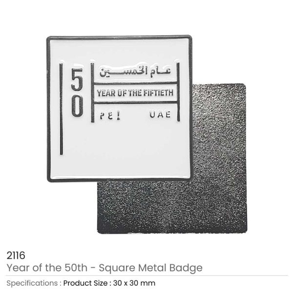 Year of the 50th UAE badges is creative and unique badges for a national anniversary. These printed badges had crafted from durable metal material. Thus, they are solid and long-lasting. This metal material is also shiny and lustrous. So, these printed badges are also glossy in appearance. The design of these pin badges is so unique. It is in the form of a square shape. The whole layout is in white. While the writings on it are in black color. Moreover, there is also a black outline on the whole structure. Promotional UAE badges are great promotional items for national events, conferences, and charity support activities. You can also use them at patriotic events to represent your country.